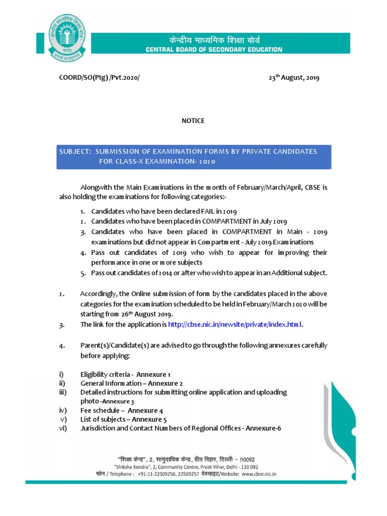 So, all the desired private students can follow the steps mentioned below to download their admit card. Regular/compt./2020 dated 12.08.2020 for details. Any form filled after the registration date of class 10th and 12th will not be considered by the cbse board. The private candidates can apply online through the official website of cbse — cbse.nic.in. The cbse class 10 and 12 examinations will commence from february 15, 2020. However, the admit card releases at the official login. All students are advised to go through the instructions available on the admit card carefully. The central board of secondary education (cbse) has released the online application for the private candidate for main examination 2020 on its official website. Generally the cbse supplementary exam form available in the august 2021. The submission of exam form by left out candidates can be filled out by december 9 while candidates who have already submitted the form can apply for the correction of data by december 14, as per the latest notice. The last date to apply is 30th september 2019. Application submission mode is purely online. The form submission process is over.